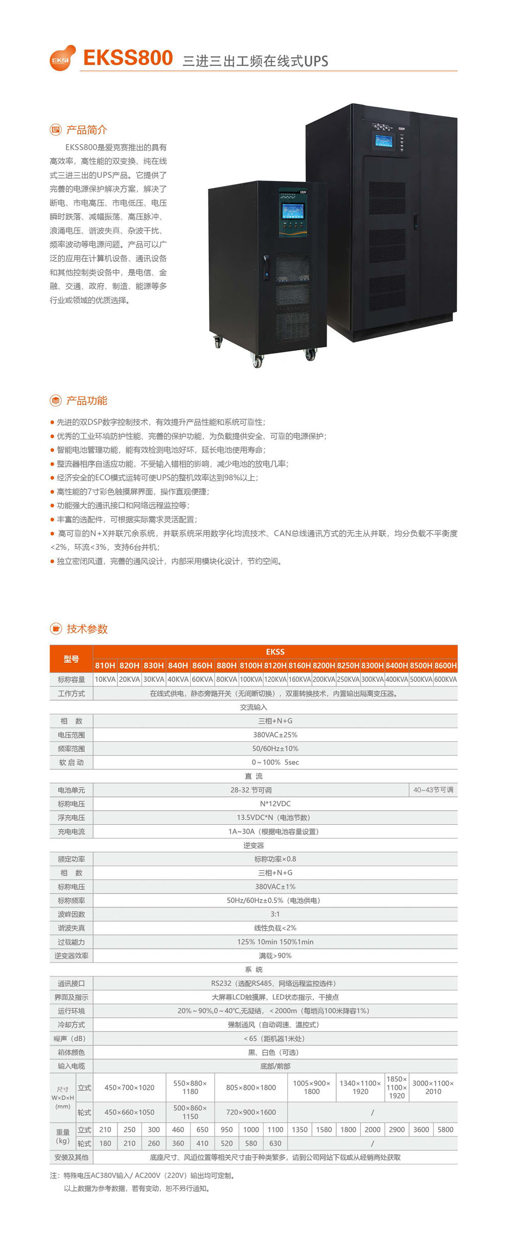 愛克賽EKSS800系列塔式三進(jìn)三出工業(yè)級(jí)工頻在線式UPS電源采用在線式雙變換電路設(shè)計(jì),DC/AC逆變器采用SPWM脈寬調(diào)制技術(shù)、IGBT功率模塊以及輸出隔離變壓器,使UPS的輸出為一外穩(wěn)頻穩(wěn)壓、純凈、不受電網(wǎng)波動(dòng)干擾的正弦波電源。
